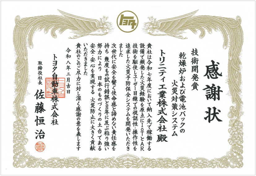 本受賞は、乾燥炉および電池パック設備における火災対策として、IoT・AR技術を活用し、現場の ”分かりやすさ・使いやすさ” を重視した火災予防保全システムの開発が高く評価されたものです。